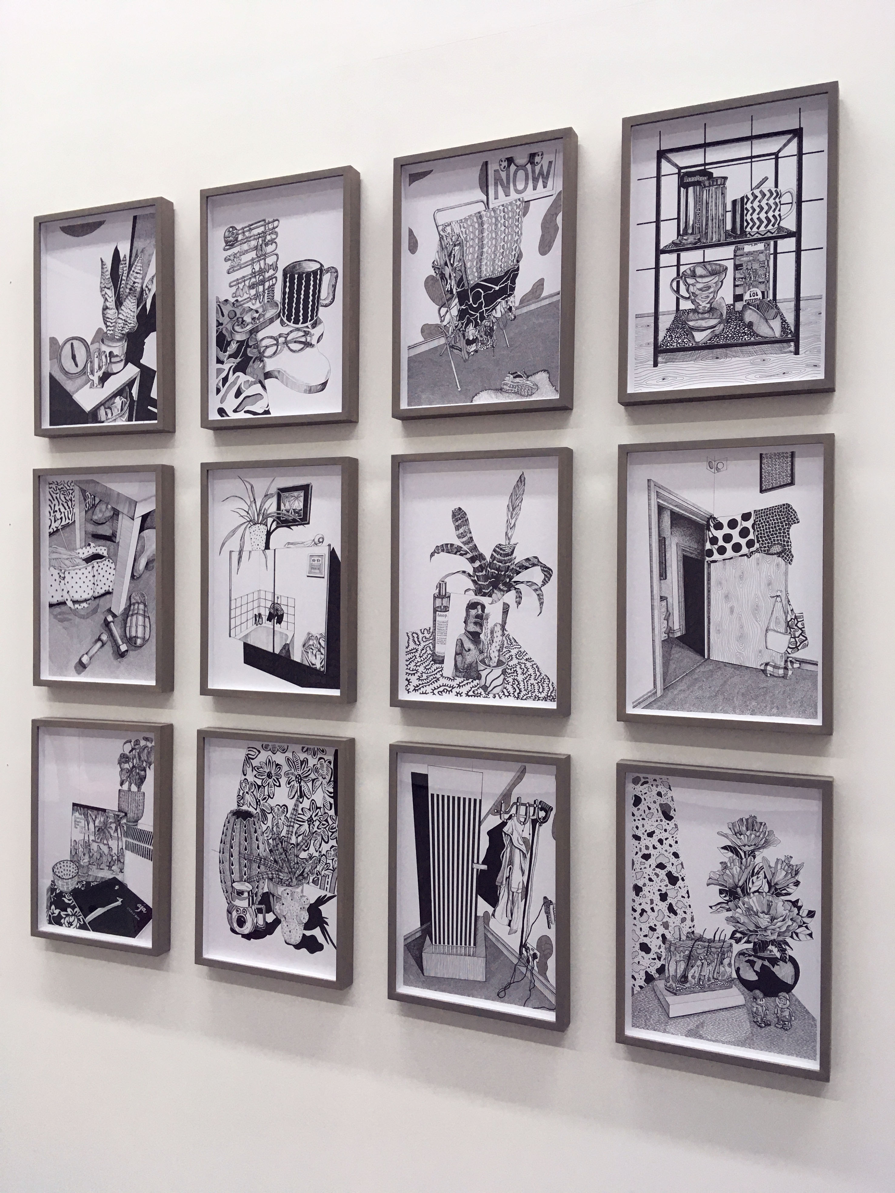 The black pen drawings are framed without a mount in tulip wood with a grey wash. The artwork is set back from the glass by a white spacer. The drawing ‘Now’ is also available as an unframed archival giclee print.